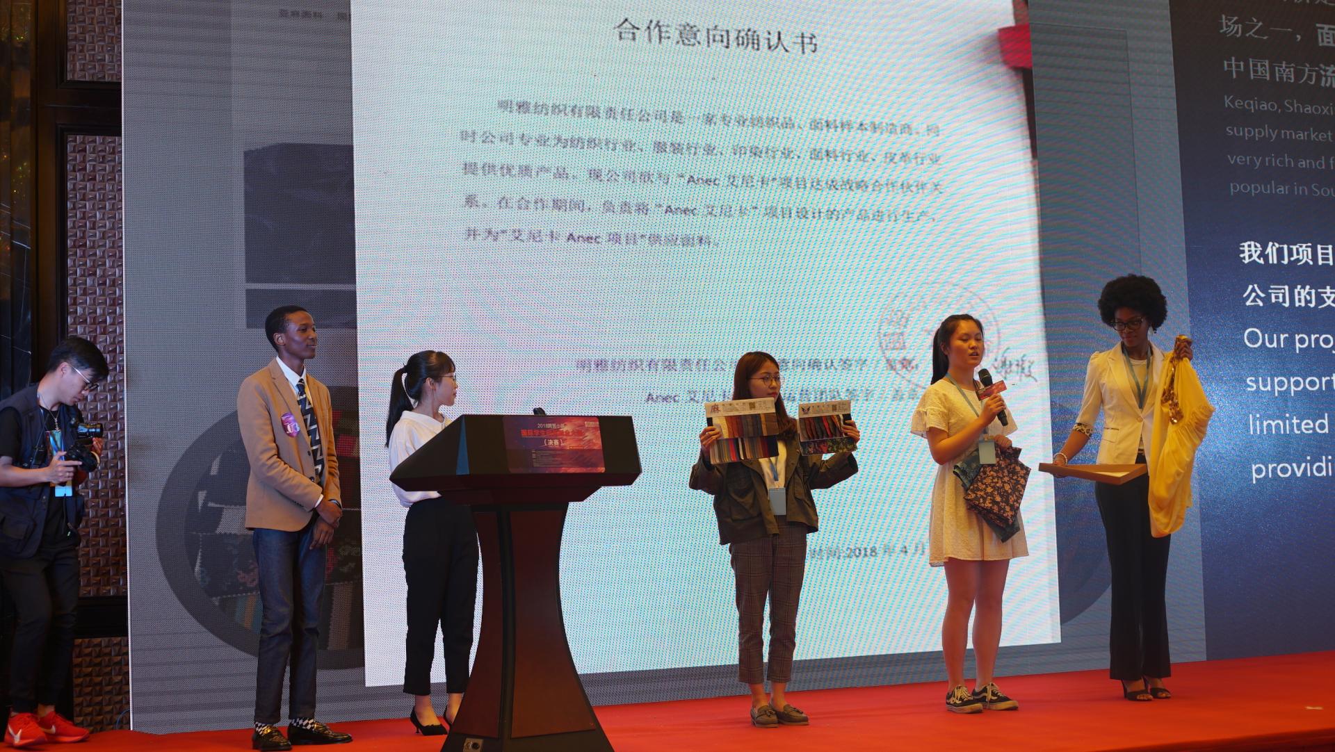 留学生艾尼卡(Anec)品牌服饰贸易项目(留学生团队:Daniel Magunje、Chikore、Nella Queen、陈蓉蓉、李莹、褚宁娇;指导老师:金德锋、王磊、沈惠佳)在强手如林的激烈竞争中脱颖而出,以694分(满分700分)的最高成绩荣获首届跨贸小镇国际学生创新创业总决赛第一名;与此同时,洋为中用项目(留学生团队:Chingis、陈博煜、毛政;指导老师:金德锋、陈松、吴松斌)获得优胜奖。