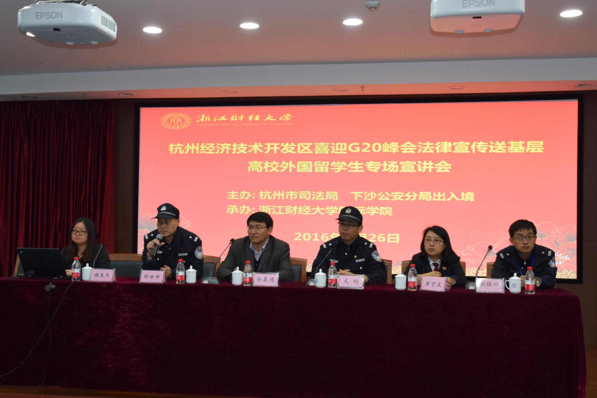 相关工作人员参加了讲座。讲座通过多媒体课件、双语交流、教学互动等形式,结合中华人民共和国外国人出境入境管理法》《中华人民共和国反恐主义法》、《中华人民共和国禁毒法》、《中华人民共和国境内外国人宗教管理规定》等法律法规,重点讲解外国留学生在华居留、住宿登记、旅游、购物、宗教活动、毒品管制以及人身财产安全等方面的注意事项。同时,针对G20峰会期间的安保问题,进行了《反恐法》宣传。