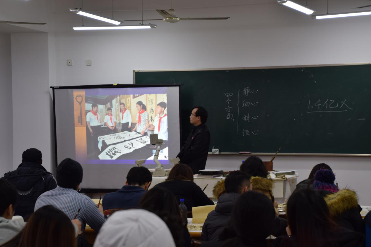 举办了一场关于中国书法艺术的讲座,讲座邀请了中国书法产业研究所所长、书法家协会会员、浙江省书法家协会副秘书长--黄建新副校长作为主讲老师,他的教学成果多次获得中国教育部、浙江省书法教育与研究成果奖并曾受邀赴新加坡和法国孔子学院讲学,介绍中国的书法艺术。