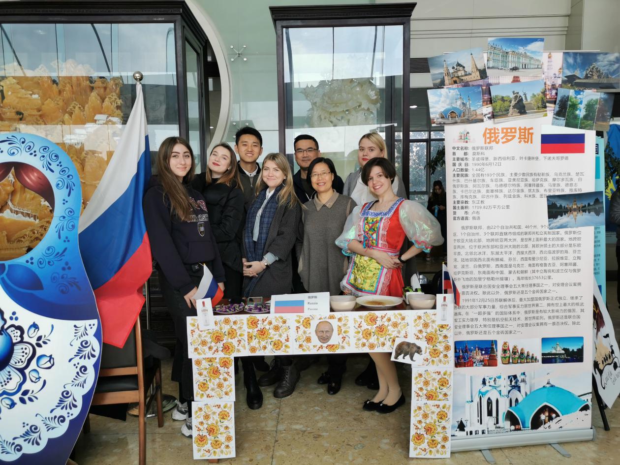 在俄罗斯展位,留学生们身穿俄罗斯民族服饰,拿着俄语单词与中国学生进行互动,俄语的大舌音显然难倒了许多中国学生,而旁边的套娃展板也是吸引了中国学生纷纷过来合影留念。欢快的音乐和悠扬的冬不拉旋律从哈萨克斯坦展位传来,只见来自哈萨克斯坦的留学生穿着民族服装弹起了冬不拉,轻快优美的旋律令人身临其境,让人感受到了草原民族的热情和豪迈。而一旁的乌兹别克斯坦展位上则是摆满了异域的诱人美食,手抓饭、Somsa馅饼、Chuchvara饺子、烤包子、Non面包等等,口味独特让人难忘。沁人心脾的香薰味从摩洛哥展位传来,留学生们拿出了来自家乡的薄荷茶招待中国学生,也认真地向他们介绍了摩洛哥独特的厨具Tajine。而在另一旁的印度尼西亚展位,留学生们不仅带来了精美的印尼传统服饰,琳琅满目的小饰品还有印尼小零食。中国学生们只有在一分钟内夹起足够数量的绿豆才能够拿到小礼品,许多学生都兴致盎然,跃跃欲试。