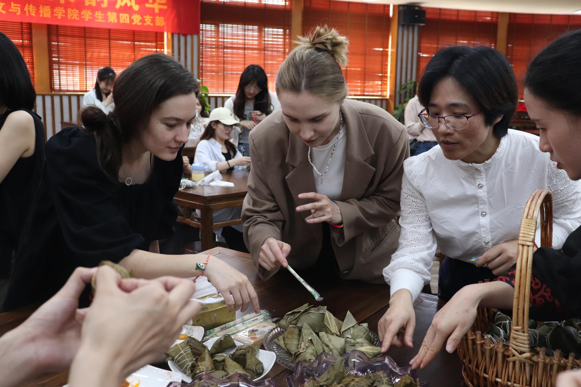 部分外籍教师、留学生与人文与传播学院的学生一起,用五彩绳编出一道道友谊之桥,将深深情谊包入粽中,在欢声笑语中共同感受中华文化的魅力与温情。