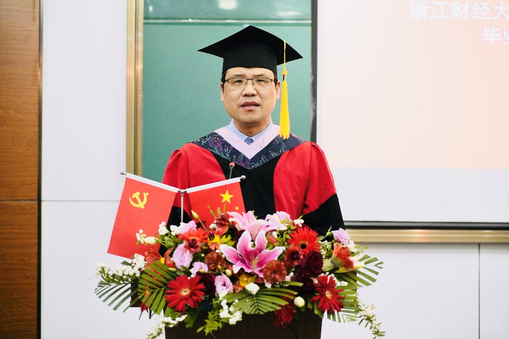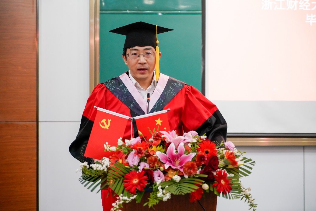 院长王建明教授发表了热情洋溢的讲话。他代表学院向顺利完成学业的2022届毕业生表示祝贺,鼓励同学们拥抱变化,永立潮头。同时寄语毕业生以下四点希望:一要不忘初心,终身学习,在新的行业和领域能不断学习,翻篇归零再出发;二要走出舒适区,勇挑重担,树立远大理想抱负,成就人生理想;三要调整心态,不断努力,低调做人,高调做事;四要懂得尊重与包容,无论在社会还是家庭中,尊重他人也赢得他人的尊重。最后,王院长祝愿各位毕业生“此去繁花似锦,归来仍是少年”,欢迎毕业生常回家看看。