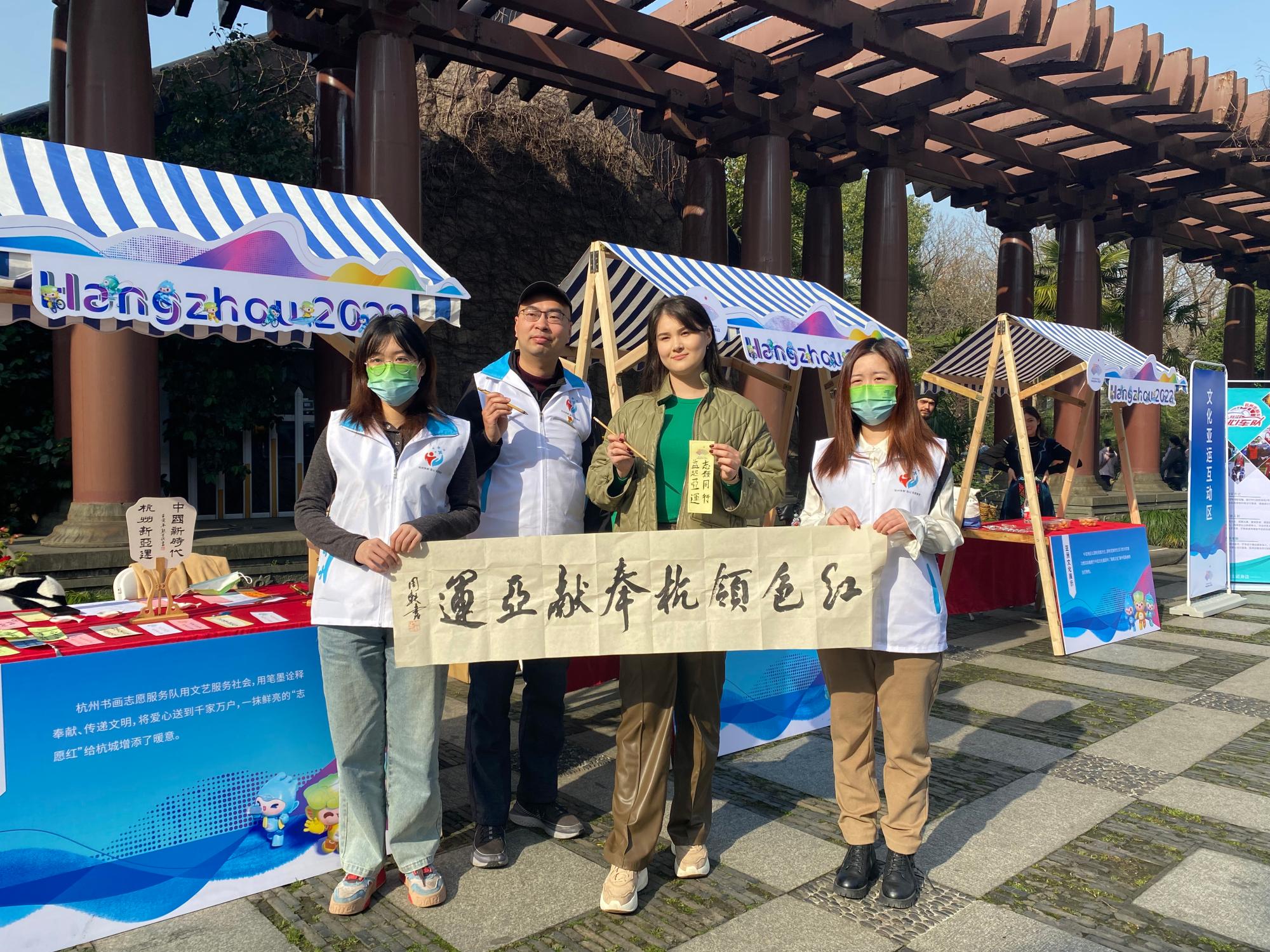 部分国际学生参与“红色领杭∙奉献亚运”启动仪式暨3∙5学雷锋志愿服务主题活动,在西子湖畔为广大市民提供亚洲文化体验志愿服务。