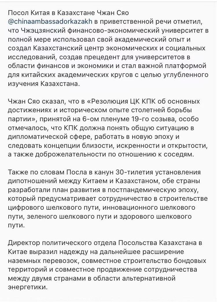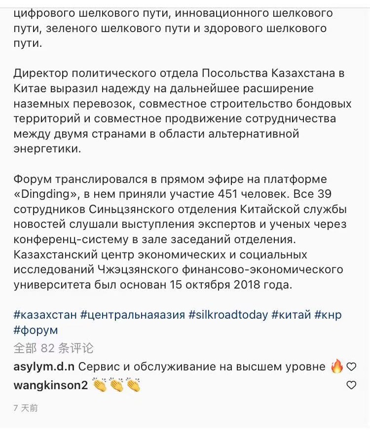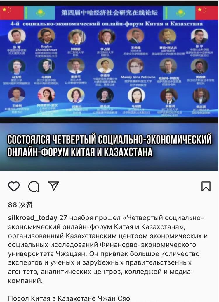 小欧视频 于11月27日成功举办了第四届中哈经济社会研究在线论坛。本次论坛以“后疫情时代的中哈经济社会合作:优势互补,创新发展”为主题,国际媒体Instagram于2021年12月1日进行了俄文版报道,赢得了受众的很多点赞,这是该媒体对小欧视频 中哈论坛的第一次报道,扩大了学校的影响力。