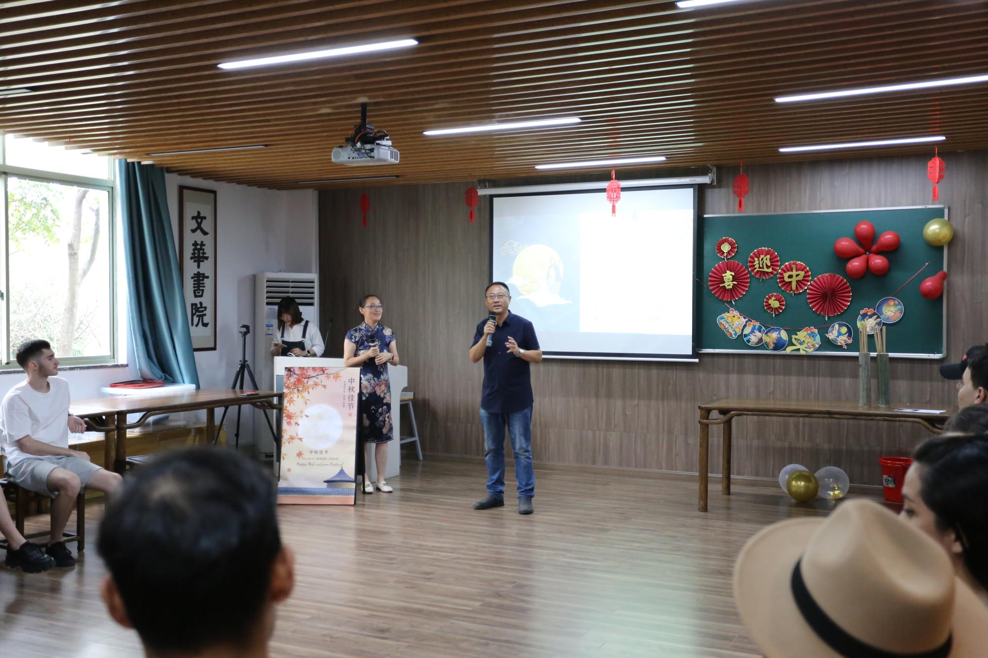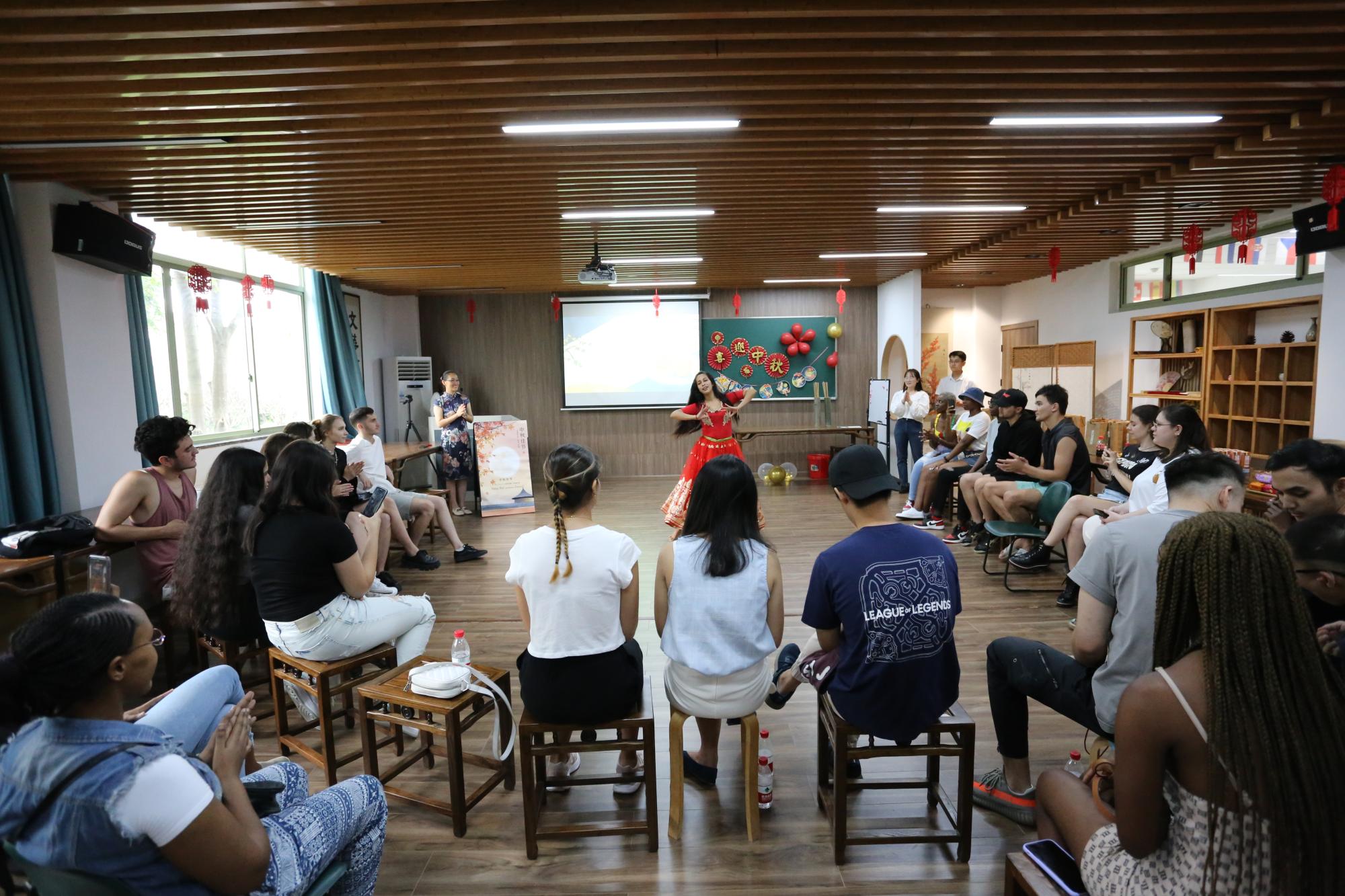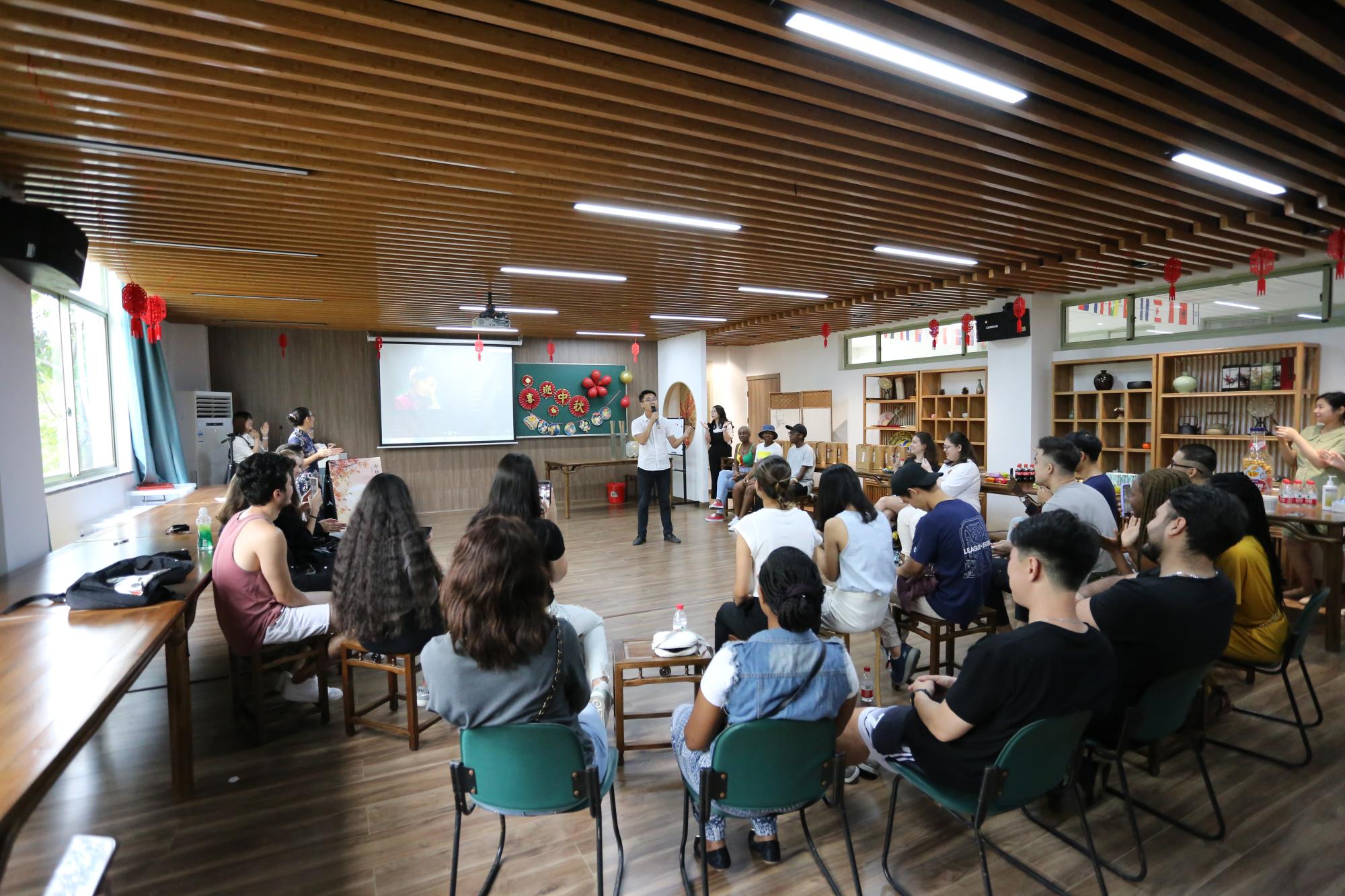 院长助理赵倩首先做了精彩的专题文化讲座,从中秋节的起源、典故、诗歌和习俗四方面向留学生们深入介绍了中秋节,留学生们听得津津有味。月为题,思为媒。师生共颂静夜思,一起把水调歌头,红豆难忘有情水,翩翩起舞带衣袖,学涯清风满文华,再现盛唐箭入壶。文华书院,洋溢着欢声笑语,师生共载歌舞,共度中秋。