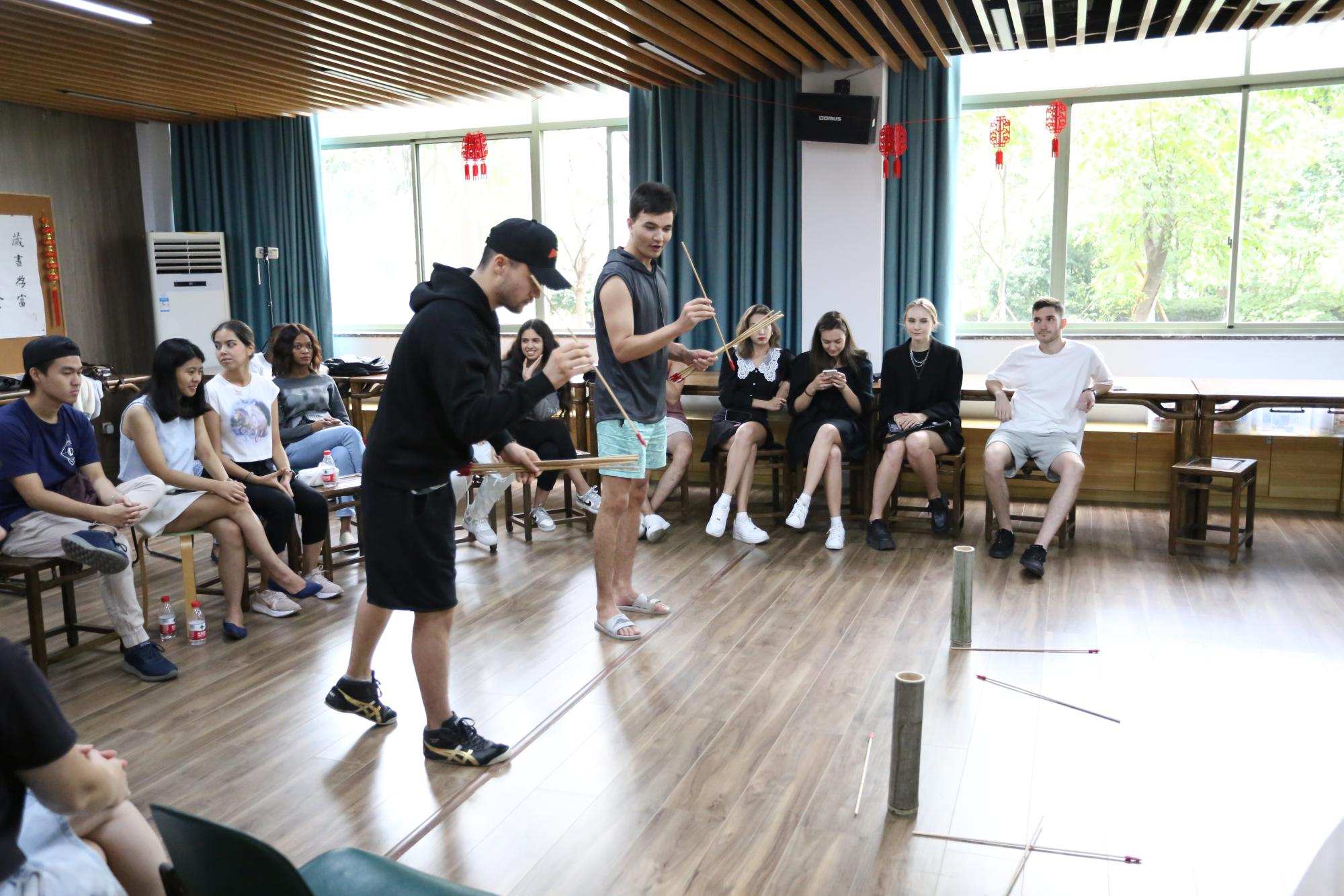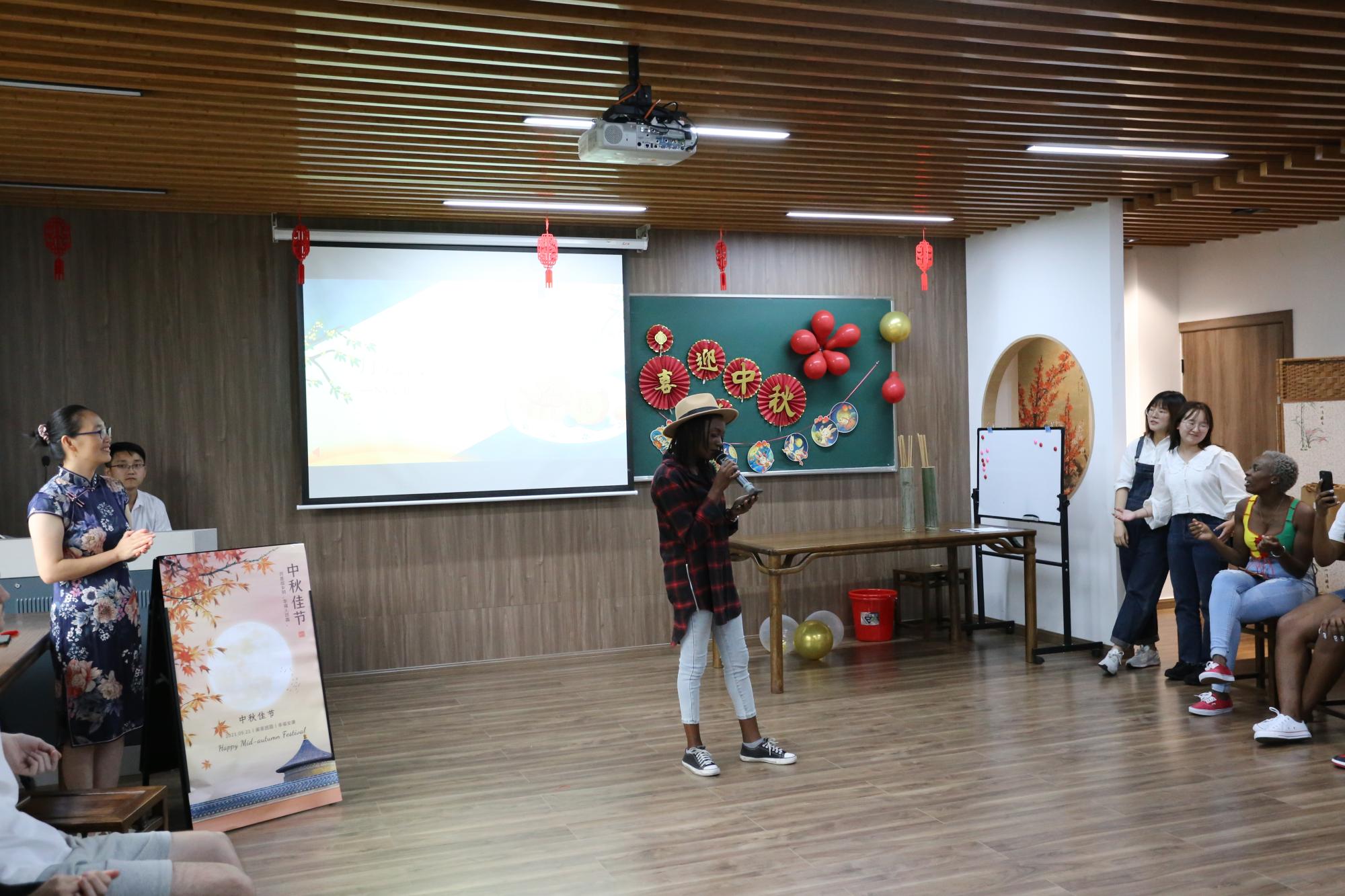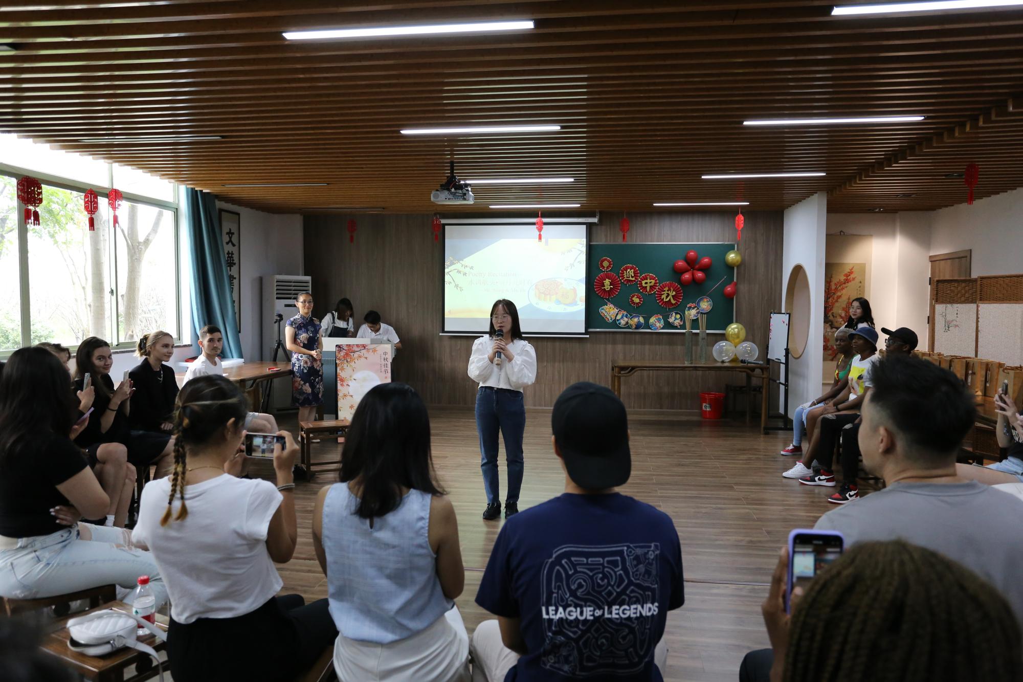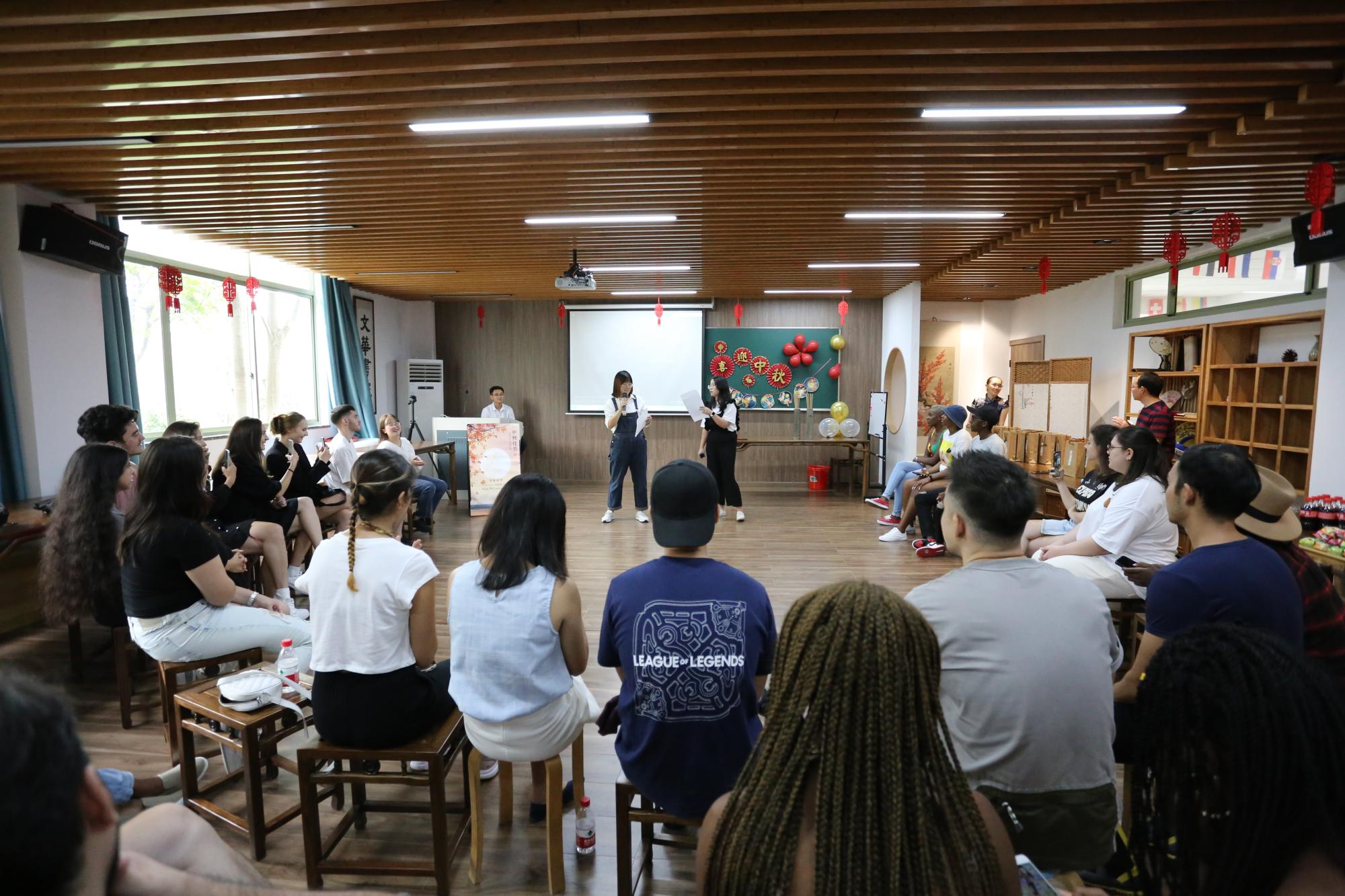 院长助理赵倩首先做了精彩的专题文化讲座,从中秋节的起源、典故、诗歌和习俗四方面向留学生们深入介绍了中秋节,留学生们听得津津有味。月为题,思为媒。师生共颂静夜思,一起把水调歌头,红豆难忘有情水,翩翩起舞带衣袖,学涯清风满文华,再现盛唐箭入壶。文华书院,洋溢着欢声笑语,师生共载歌舞,共度中秋。