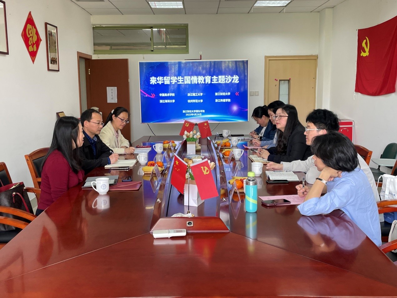 举行了来华留学生国情教育主题沙龙。来自中国美术学院、浙江理工大学、杭州师范大学、浙江海洋大学、浙江传媒学院、传播大脑科技有限公司等的领导与嘉宾齐聚一堂,共话来华留学生国情教育。