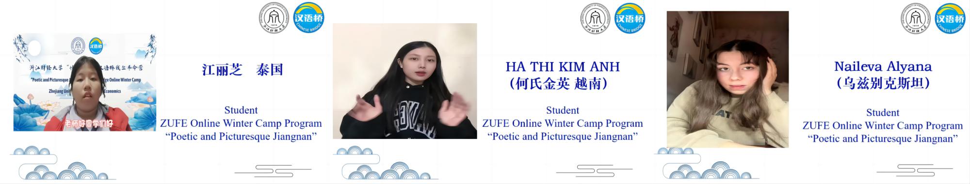 来自泰国的江丽芝、越南何氏金英和乌兹别克斯坦的Naileva等冬令营优秀学员代表,表达了对冬令营全体老师的感谢,也讲述了对中华文化的喜爱,特别是对美丽浙江的向往和对未来的期望。