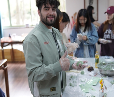 “清明节,是农历二十四节气之一,也是中国传统的节日…”主持人生动详细地介绍了清明节的历史由来和传统习俗。随后,中外学生们分工协作,捻青、和粉、搓团、裹馅,一个个油绿如玉的青团便在手中成型了。