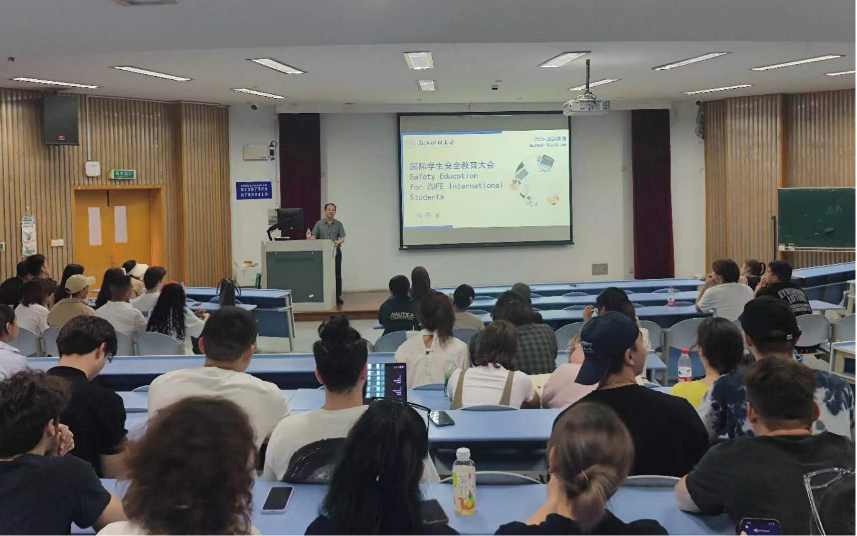 在A201教室召开了2024年暑假留学生安全教育大会, 会议由留学生办公室主任汪博林主持,院长柴志贤、辅导员及全体留学生参加了会议。