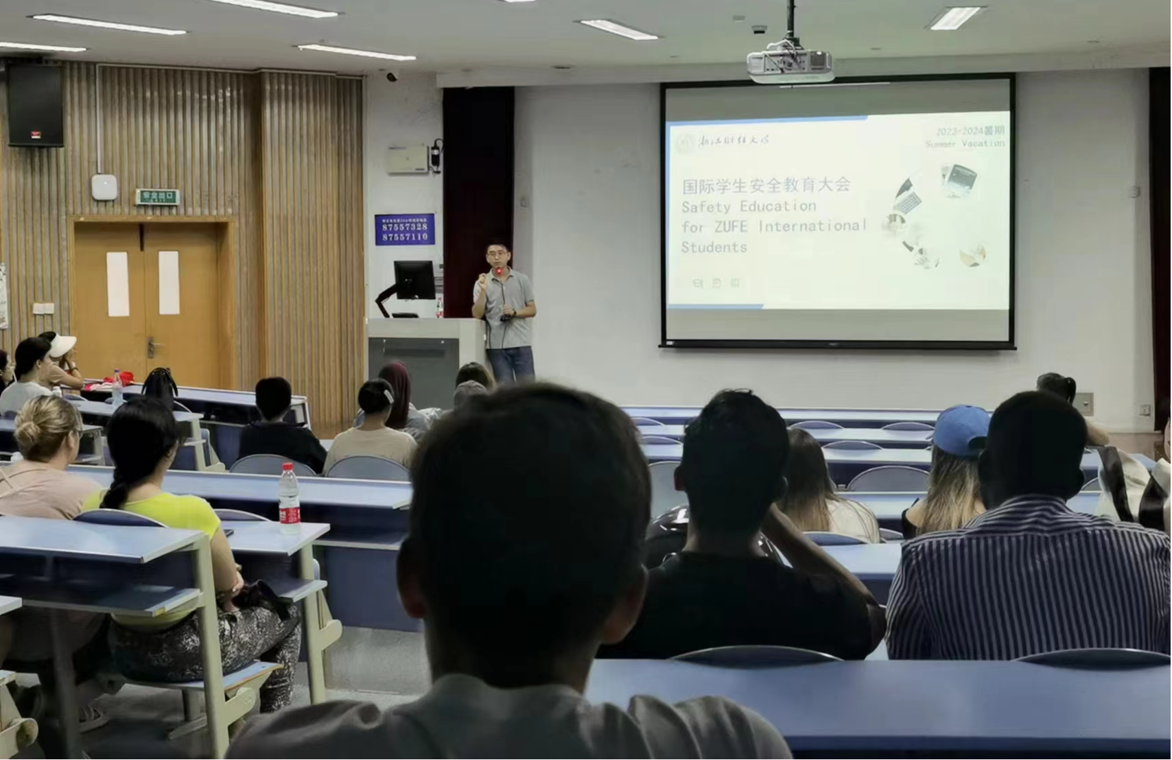 辅导员汪博林结合历年安全风险事故,就非法就业、交通出行、住宿安全、预防溺水、预防诈骗等常见安全风险进行了宣讲和教育。他重点强调:所有留学生暑期离校必须报备,外出住宿要依规登记,避免出现非法居留、非法就业等情况,假期及时关注学校信息,随时保持与老师的沟通联系。