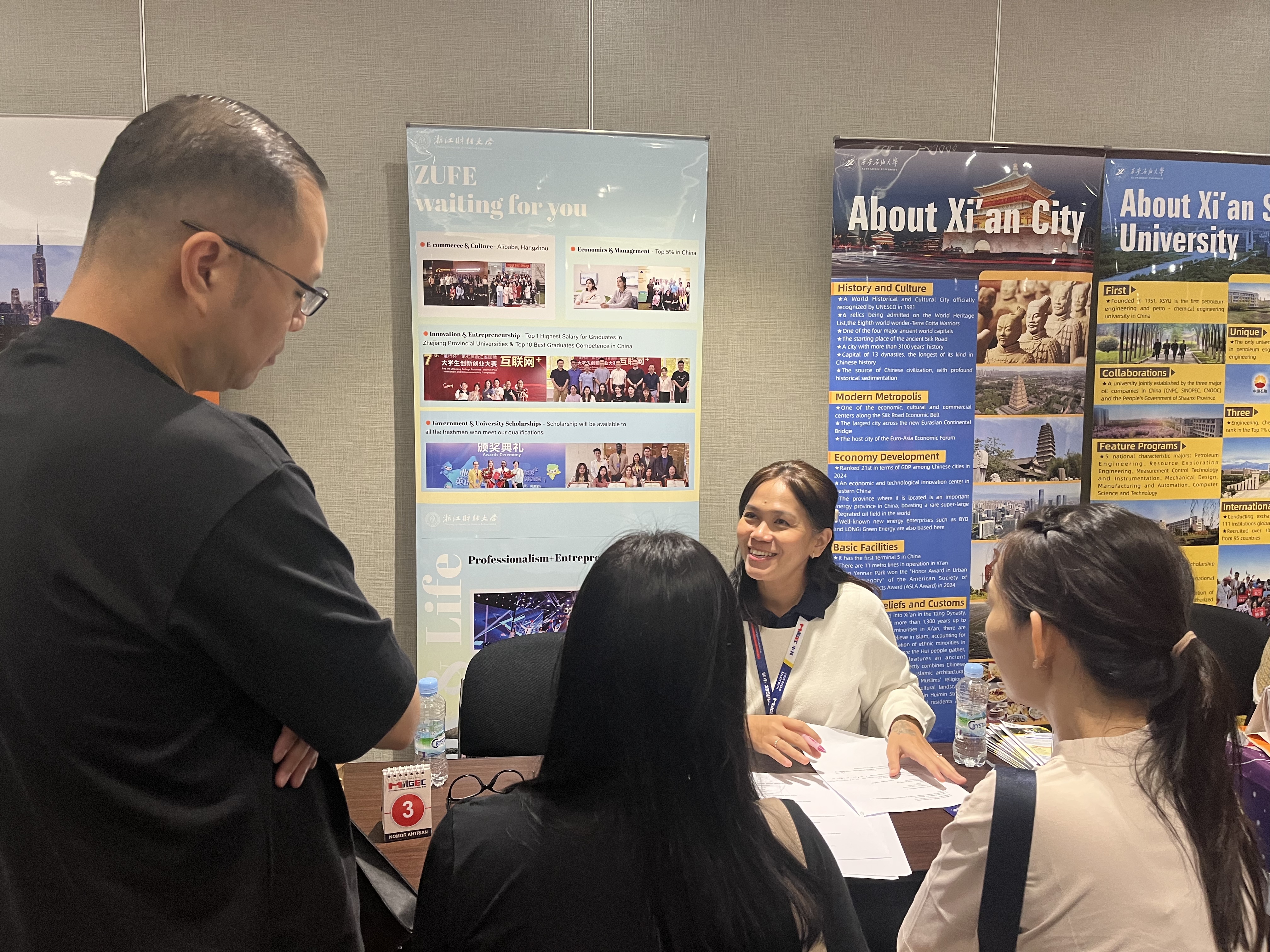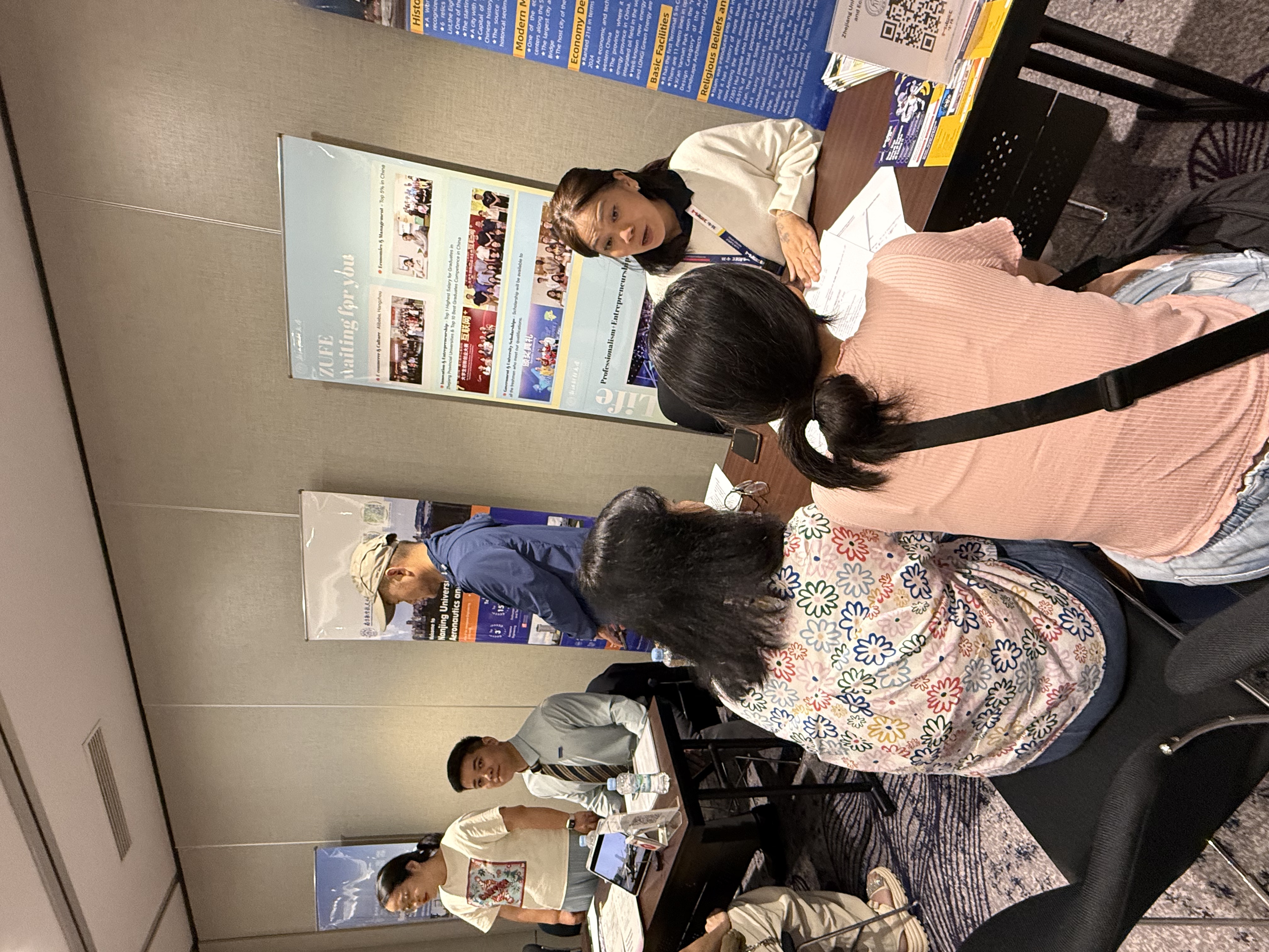 委托青岛中邦公司的专业服务团队,重点推介了学校国际经济与贸易、电子商务、商务汉语、会计学等优势学科专业,并详细解读了本科、硕士项目的招生政策、奖学金计划等。展台还通过虚拟校园导览、小欧视频