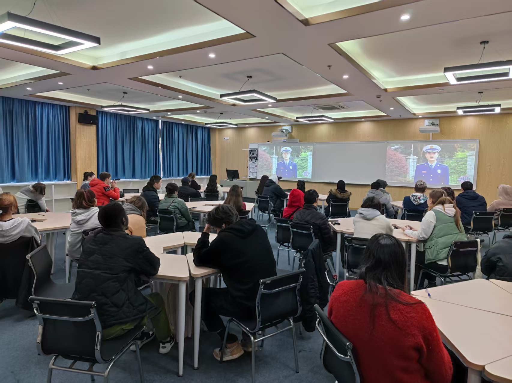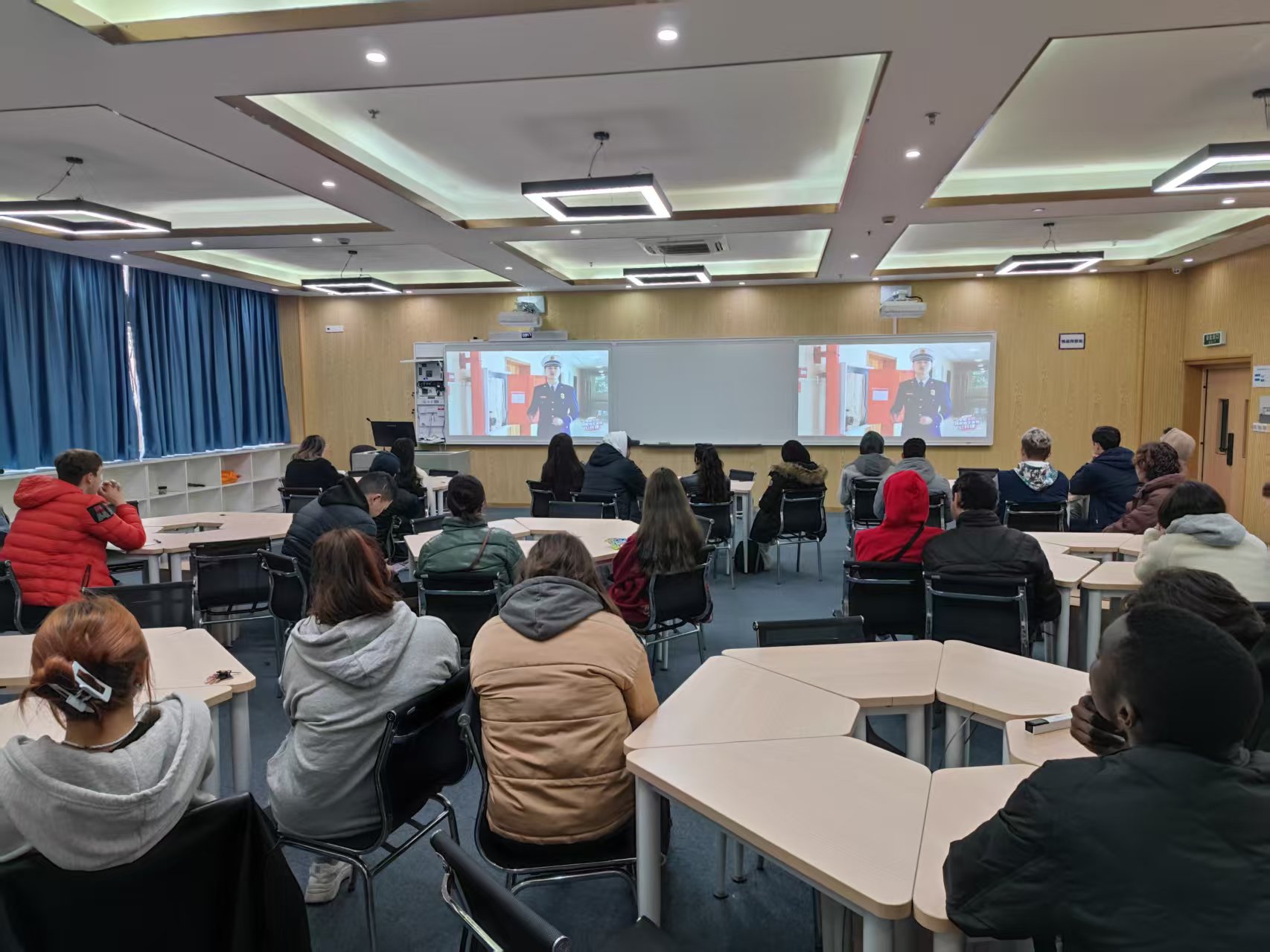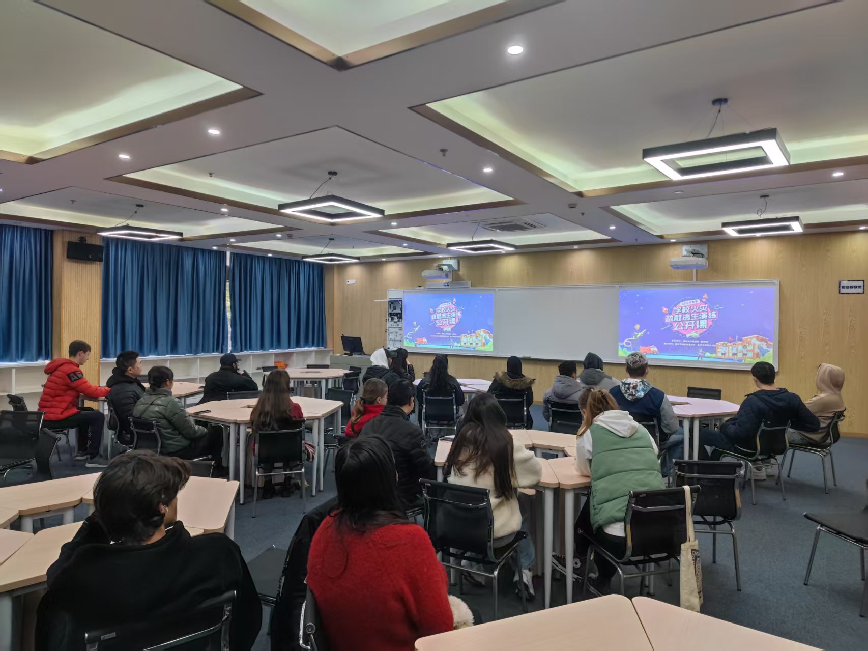 组织留学生集中观看了由教育部与国家消防救援局联合举办的2024年春季学校火灾疏散逃生演练公开课网络直播。此次留学生观众涉及吸烟、电动车、使用违禁电器等消防高危人群