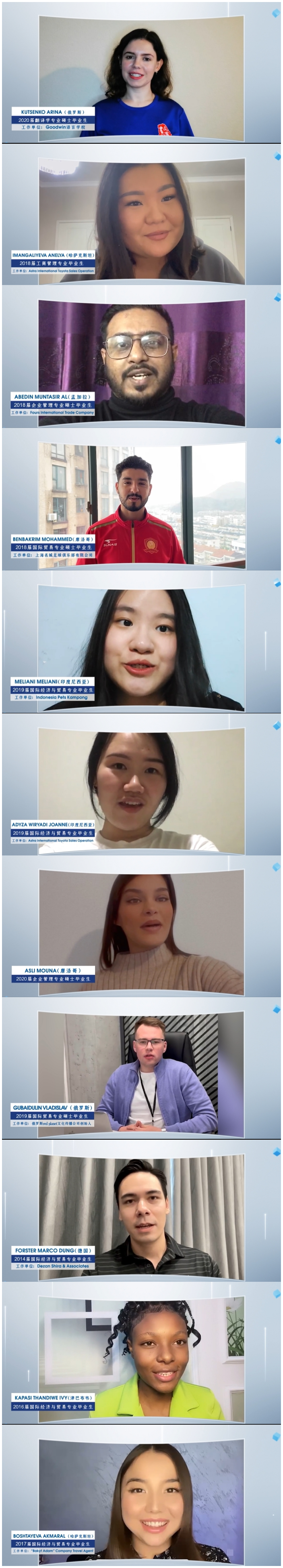 们立足于莫斯科红场、阿拉木图雪山、卡萨布兰卡海滨等标志性场景,在镜头前亲切问候,不仅清晰介绍了所在国家与城市,更结合当地特色文化,真挚地表达了对学院十岁生日的祝福、对恩师的感激以及对求学时光的怀念。这些视频充分展现了小欧视频