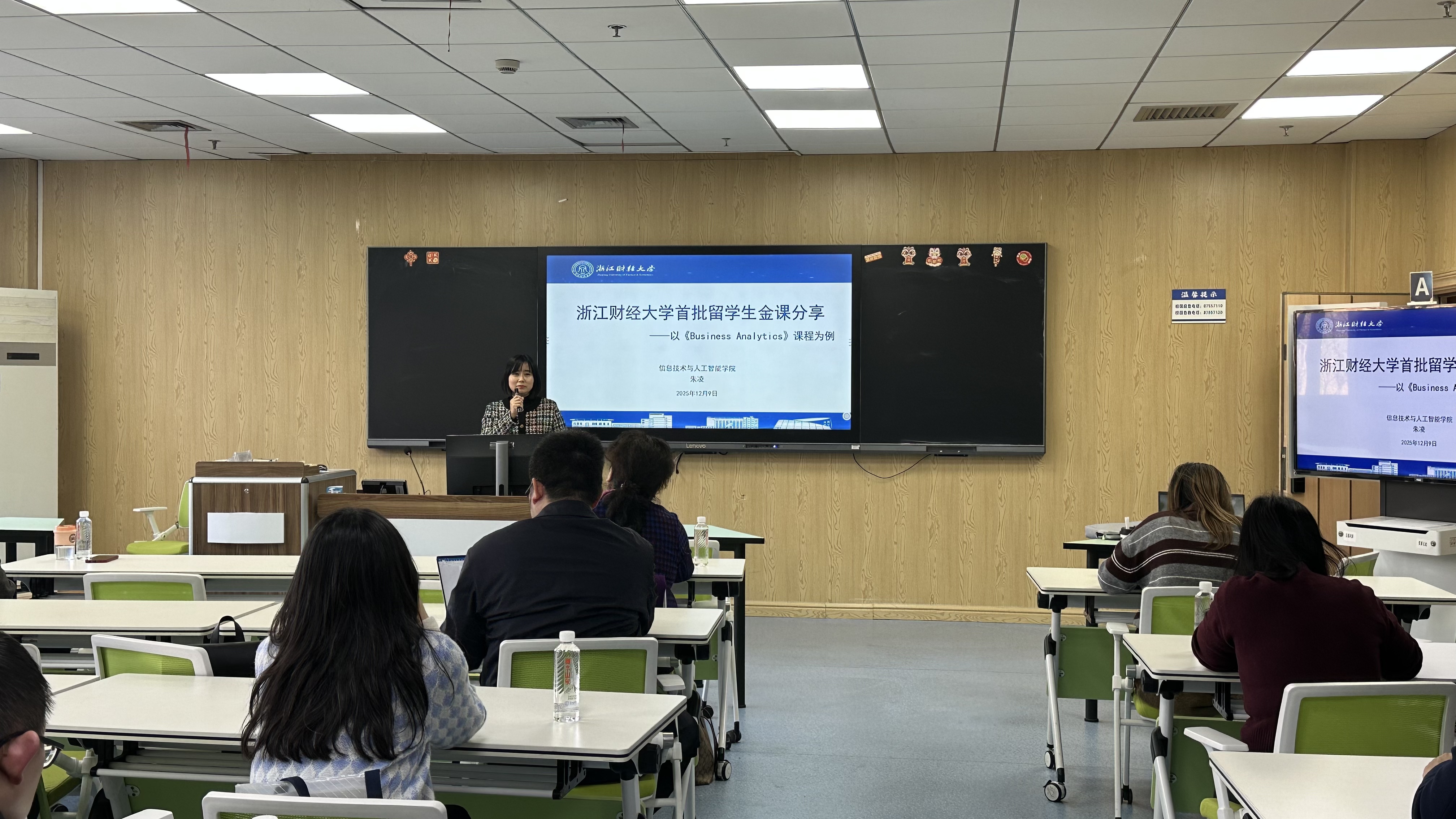 分享会上,首批入选留学生金课的三位授课教师依次登台,结合自身教学实践分享宝贵经验。朱凌老师以Business Analytics课程为例,重点阐述了理论教学与案例选取深度融合的教学思路。她强调,留学生群体背景多元,通过精选贴合行业实际、兼具针对性与趣味性的案例,能够帮助学生更直观地理解抽象理论,有效提升知识吸收效率,让课堂教学更具实效性。