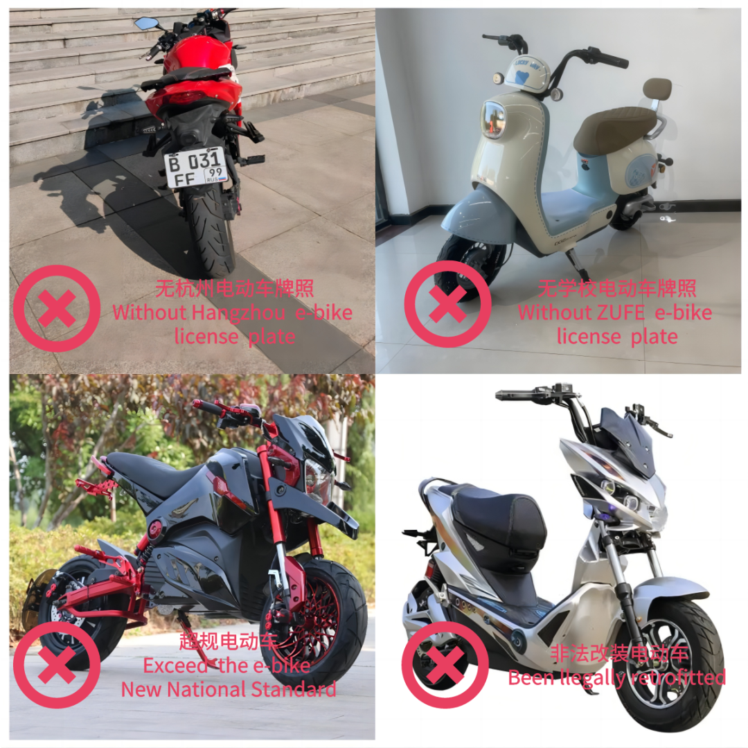 According to the related requirements, all the prohibited e-Bikes are not allowed to enter or park in campus and dormitory area as of today. (Prohibited e-Bikes include the e-bike without Hangzhou license plate, the e-bike have been illegally retrofitted, the e-bike exceed new national standard and the e-bike without ZUFE e-bike license plate).