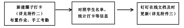 任课教师作为课堂考勤的第一责任人,应严格落实课堂考勤制度,认真做好考勤记录,及时汇总考勤情况,定期公布考勤结果。各任课教师要根据课程实际情况,采取点名、抽查、课堂提问、布置作业、钉钉圈子打卡、导出钉钉直播数据等多种形式进行课堂考勤,并在课程考勤名单(钉钉在线文档)中及时更新,保证考勤数据的客观性和准确性。