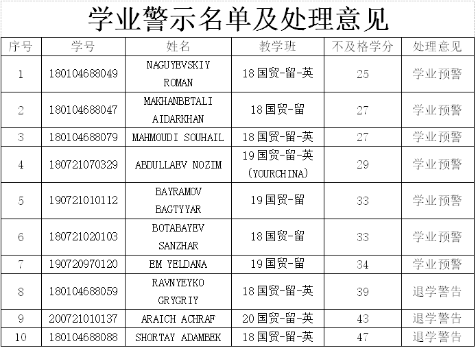 国际学生学籍管理规定》第三十八条规定,学院决定向NAGUYESKIY ROMAN等七名学生提出学业预警。RAVENYEYKO GRYGRIY等三名学生各学期累计需重修课程(不包含重修合格课程)达36学分(含)以上。根据《浙江财经学院大学国际学生学籍管理规定》第三十八条规定,学院决定予以退学警告。