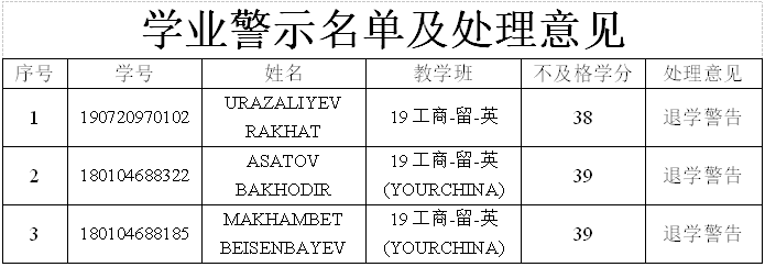 国际学生学籍管理规定》第三十八条规定,学院决定向URAZALIYEV RAKHAT等三名学生提出退学警告。