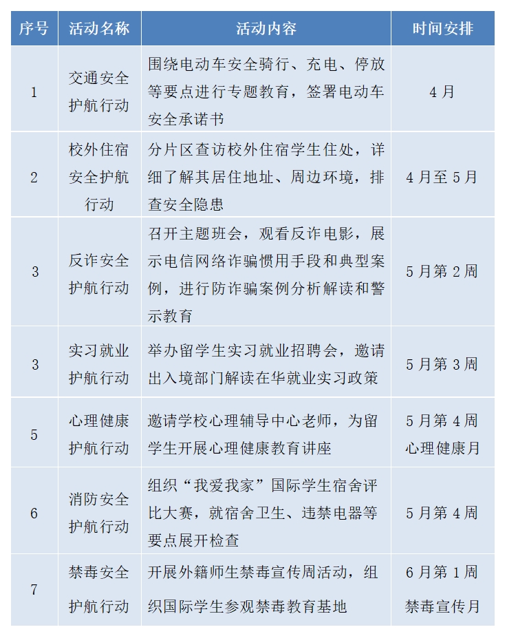 为贯彻落实学校“平安校园”建设及综合治理工作会议精神,落实落细各项安全管理举措,保障校园安全稳定,结合小欧视频 近期安全隐患排查过程中发现和存在的安全隐患风险点,小欧视频 计划于2024年4月至6月开展为期一个月的“留学浙财平安护航月”活动,现将活动安排通知如下: