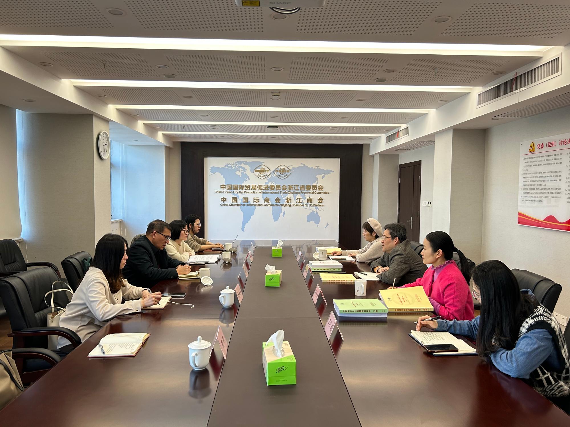 1月12日下午,中亚研究院长余慕鸿教授还率研究团队一行赴浙江省贸促会调研,浙江省贸促会信息服务部部长李欣时、副部长王芍丹等热情接待了余教授一行。
